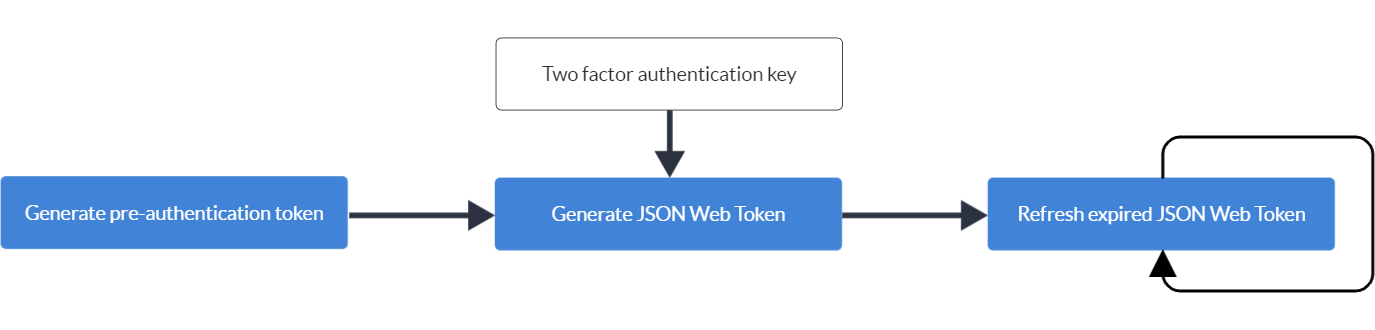 To create a JSON Web Token, you must first generate a pre-authentication token, you can then use the pre-authentication token to create a JSON Web Token; if the user has two factor authentication, the two factor key must be provided when generating a new JSON Web Token.